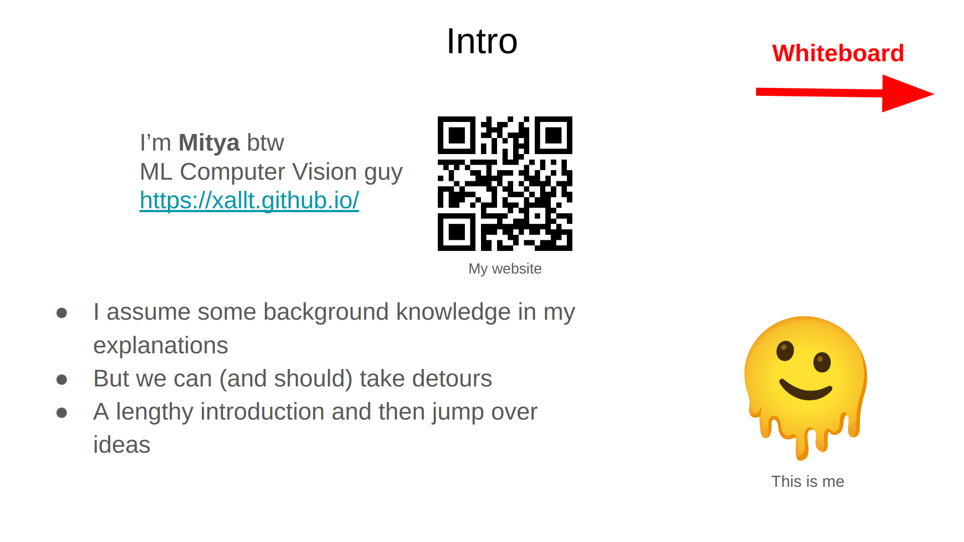 - There’s an “Introduction” slide where I introduce myself, and tell the audience about my general approach to the current lecture. For example, for my Camera Pose Estimation presentation, the intro was that the lecture is about some cool Computer Vision ideas, in chronological order, without diving too deep into each one. And in the Diffusion for 3D presentation , I started by saying that there will be a lengthy introduction, but then we’ll look at the actual content.